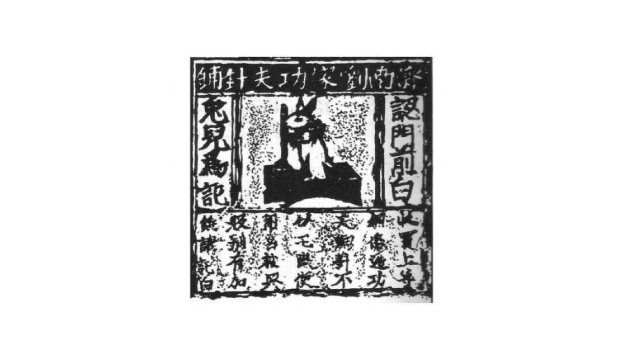 這是中國現存最早的一份印刷廣告,是宋代劉家功夫針鋪廣告,同時也是一張包裝紙, 銅版正中偏上刻著一只拿著鐵杵搗藥的白兔,白兔四周刻著密密麻麻的小字:上方為“濟南劉家功夫針鋪”;左右為“認門前白兔兒為記”;下方為“收買上等鋼條,造功夫細針。不誤宅院使用,轉賣興販,別有加饒,謂記白”。文字皆為反刻,由此推測這塊銅版應是用來印刷廣告的。它是集包裝紙、傳單、廣告三位與一體的設計形式,具有濃厚的商業色彩。