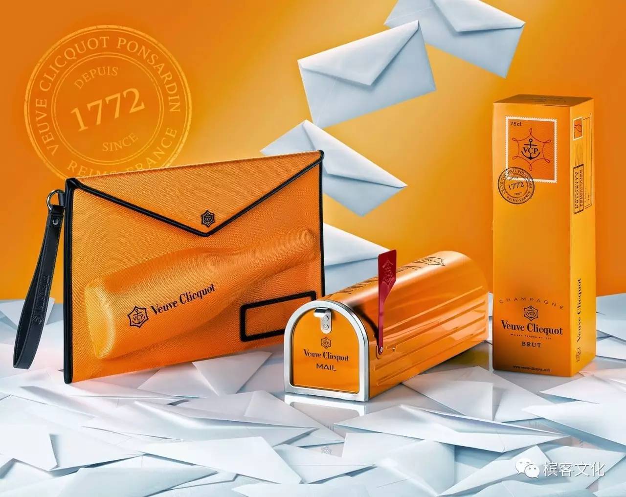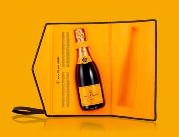 這是凱歌香檳經典的信封手提包設計,醒目的橙黃色為主色調,大面積的使用讓該包裝能夠在第一時間抓住人的視線。包裝的邊緣是棕色的,還有一條棕色的腕帶,讓整體包裝色調變得豐富、有層次起來,包上還有一條棕色的腕帶。腕帶的設計是為了方便進行攜帶,這樣客戶在趕路的時候就可以很容易地把它帶在身邊了。