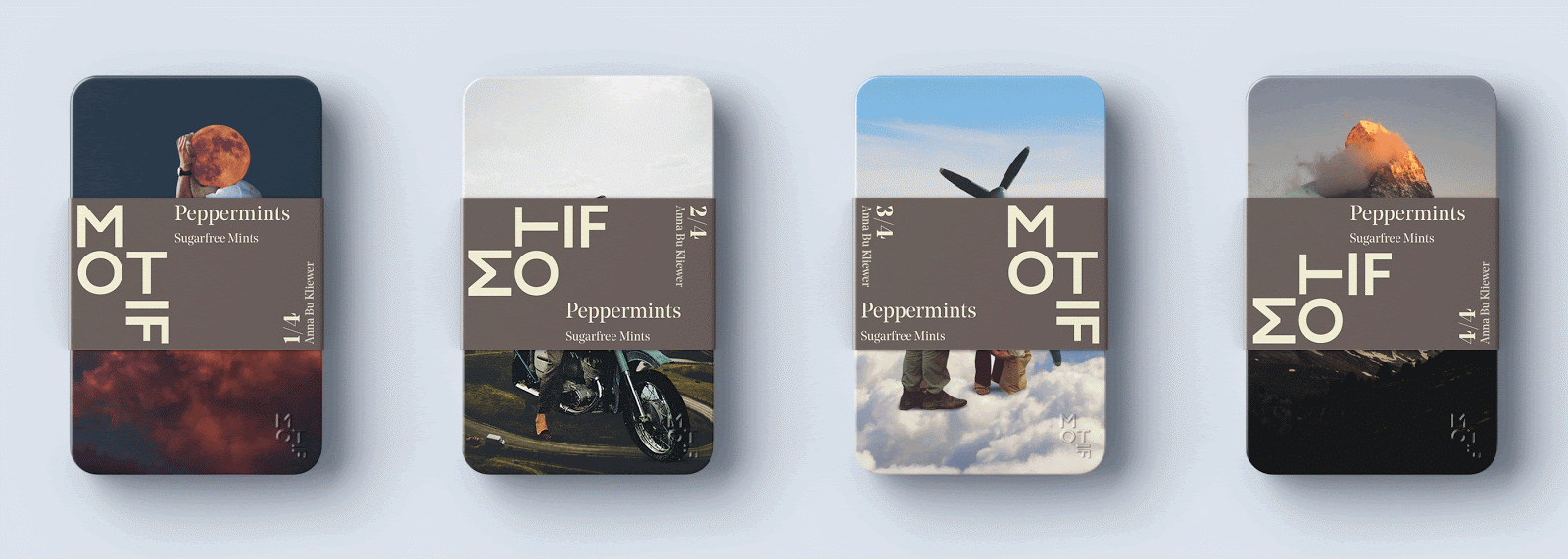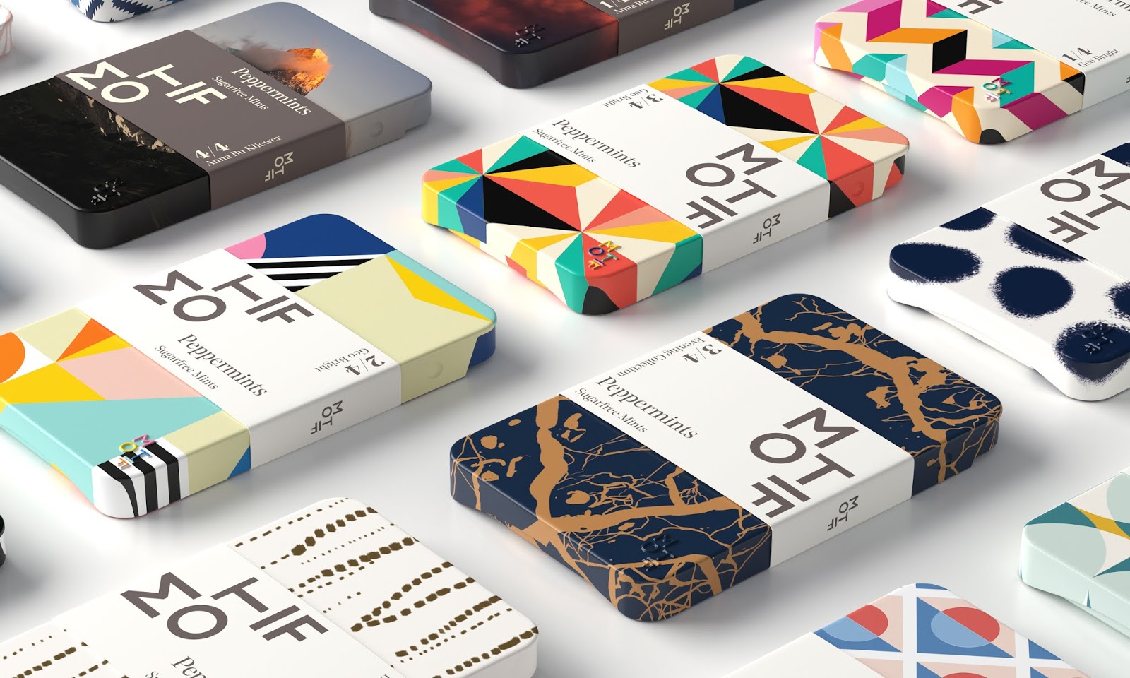 Motif薄荷糖包裝設計,使用抽象的幾何元素與風景人物進行換位的方式,突出了薄荷糖,口味刺激多變的特點。