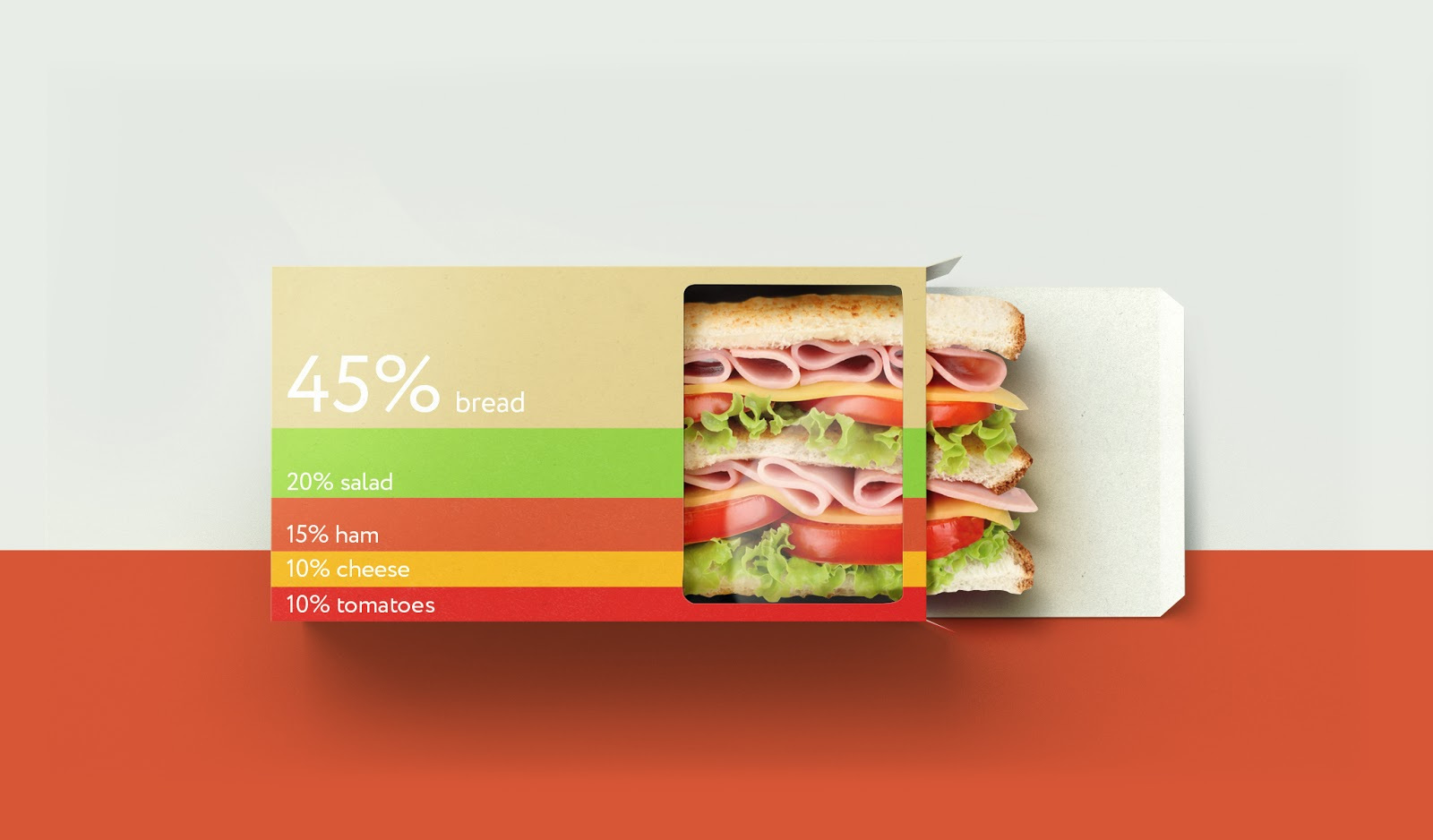 整體設計非常簡潔,大膽亮麗的色彩,在包裝上還標注了三明治中的營養成分,留白的“視覺窗口”將產品的原料展現在消費者眼前,給消費者創建了很好的觸覺體驗,使產品更加真材實料,給人留下一種奇特的心理感受。